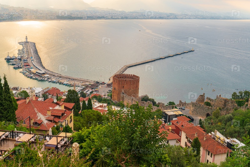 Вид на порт Аланья с маяком и Красной башней, Турция.Мирная атмосфера раннего утра, когда порт тихий, море стеклянное, а первый свет дня окрашивает стены крепости