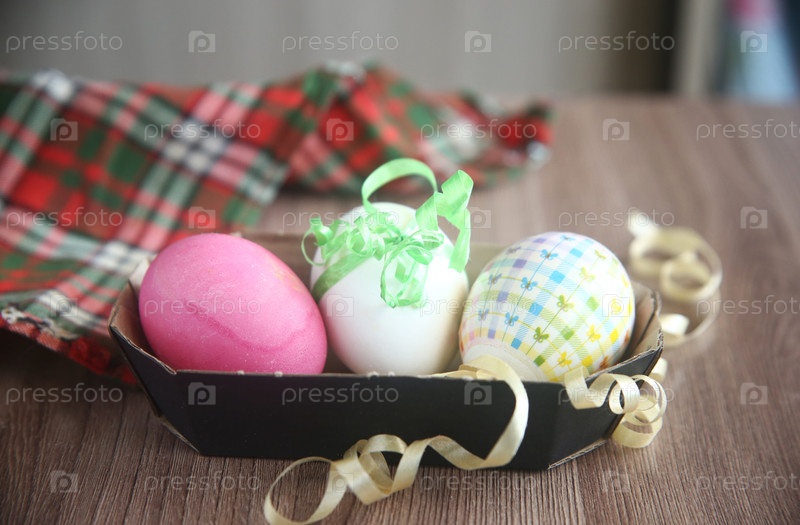 Яйца пасхальные украшенные на столе, крупный план. Празднование Пасхи