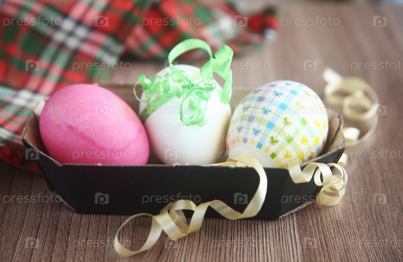Яйца пасхальные украшенные с лентой на столе, крупный план. Празднование Пасхи
