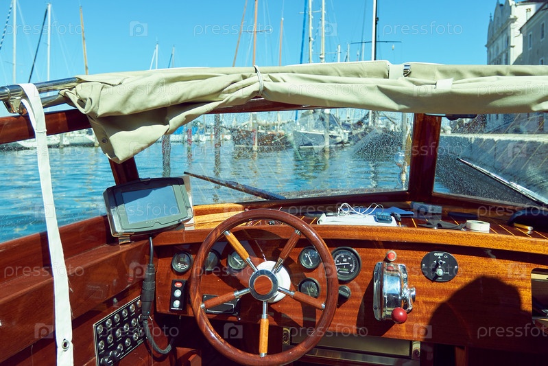 Кокпит классической деревянной яхты, находящейся в марине
