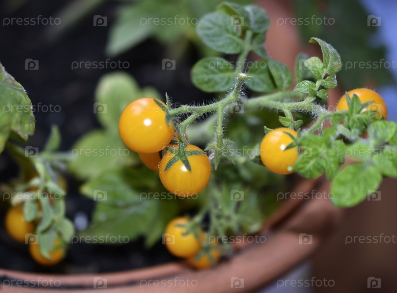 Домашние помидоры на подоконнике. Желтые небольшие плоды томатов