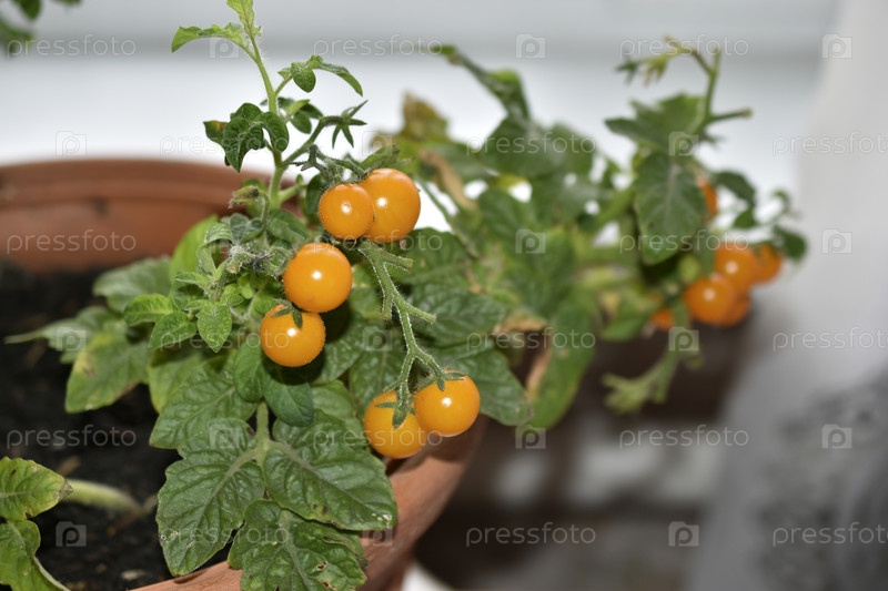 Домашние помидоры на подоконнике. Желтые небольшие плоды томатов