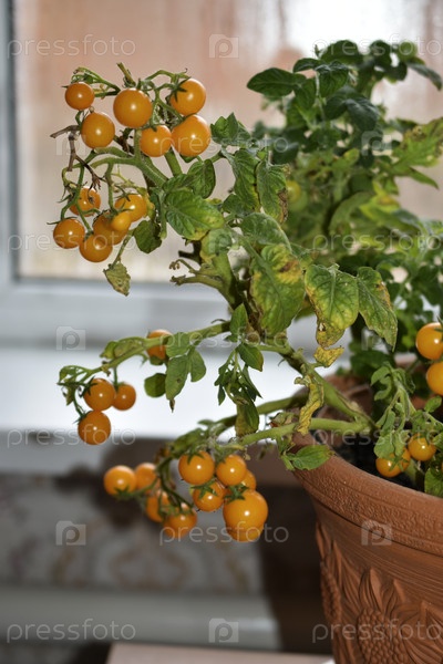 Домашние помидоры на подоконнике. Вишневые помидоры в горшке. Желтые и зеленые небольшие плоды томатов