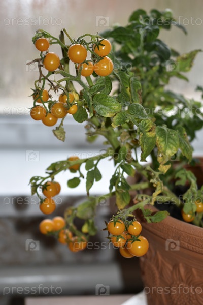 Домашние помидоры на подоконнике. Вишневые помидоры в горшке. Желтые и зеленые небольшие плоды томатов