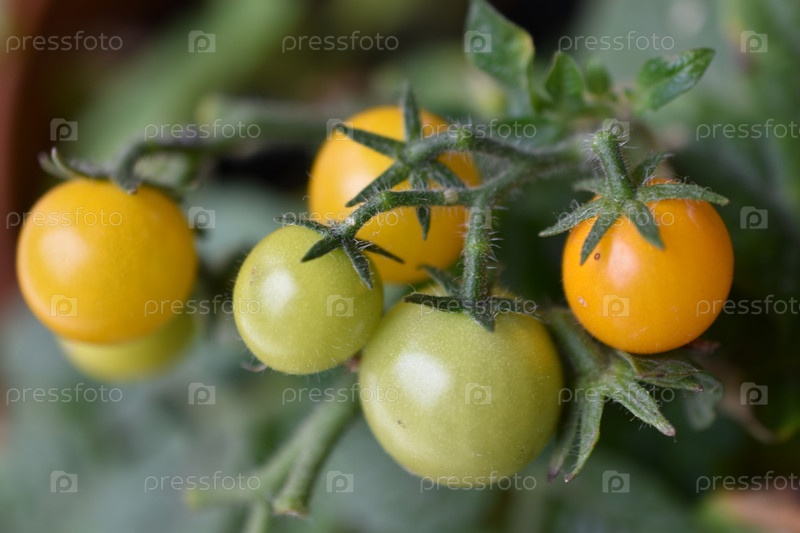 Домашние помидоры на подоконнике. Вишневые помидоры. Желтые и зеленые небольшие плоды томатов