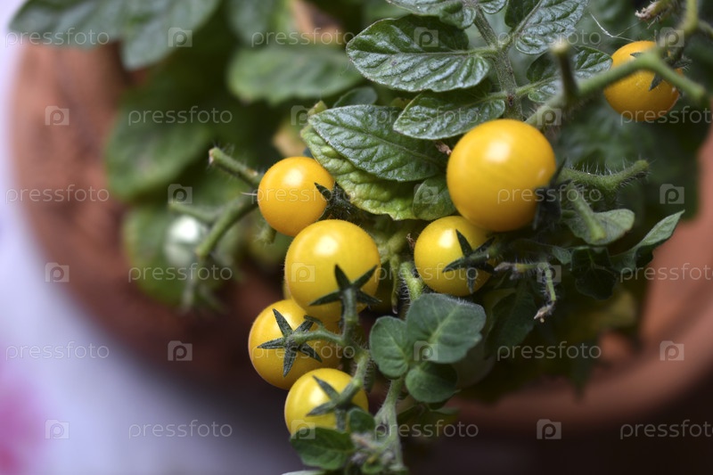 Домашние помидоры на подоконнике. Вишневые помидоры. Желтые и зеленые небольшие плоды томатов