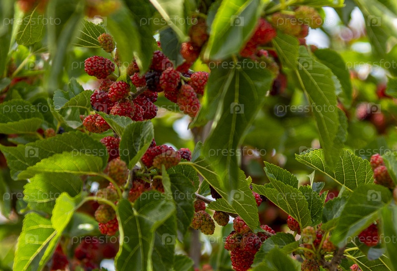 Яркая красная шелковица, созревающая среди пышных зеленых листьев