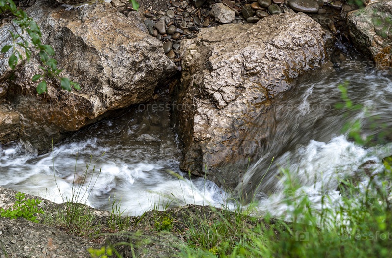 Стремительная речная вода, текущая по камням в природе
