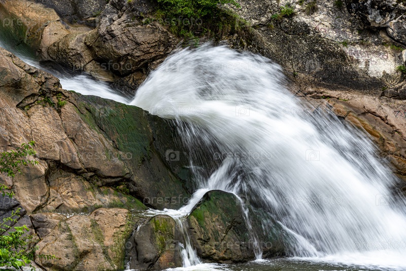 Водопад, низвергающийся каскадом со скалистых утесов в окружении пышной зелени