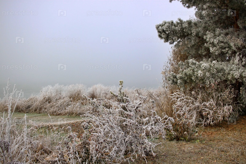 Осенний туман над рекой и иней на деревьях и растениях