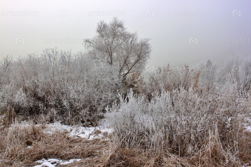 Осенний туман над рекой и иней на деревьях и растениях