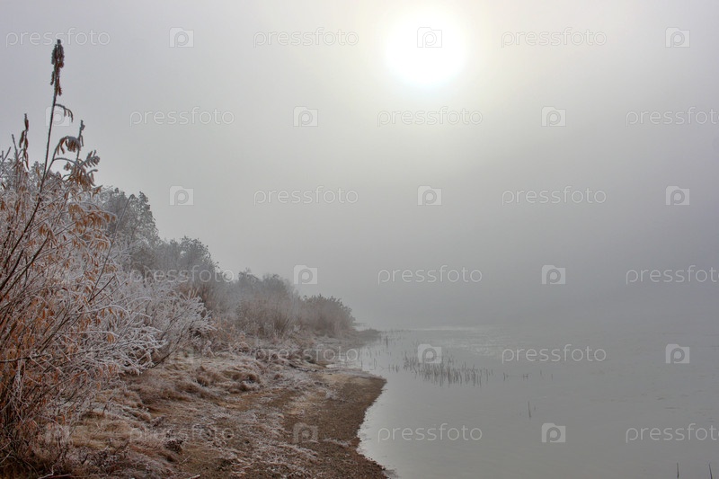 Осенний туман над рекой и иней на деревьях и растениях