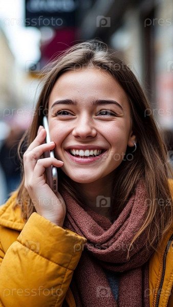 Девушка разговаривает по телефону и смеется. Красивая молодая женщина разговаривает по телефону на улице города. Девушка смеется разговаривая по телефону
