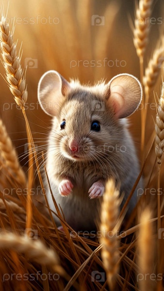 Полевка в траве. Контроль диких вредителей. Милая мышь на поле с пшеницей. Борьба с грызунами