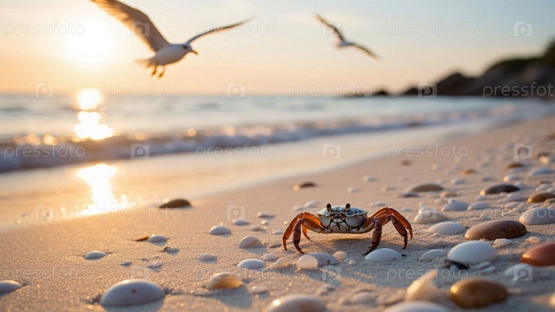 Маленький краб на пляже. Крабик на песчаном морском берегу крупный план. Чайки на море