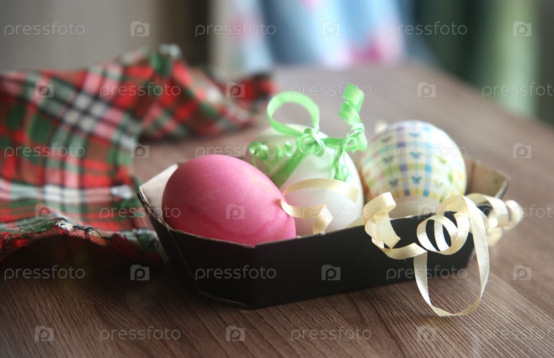 Яйца пасхальные цветные на столе, крупный план. Праздник светлой Пасхи