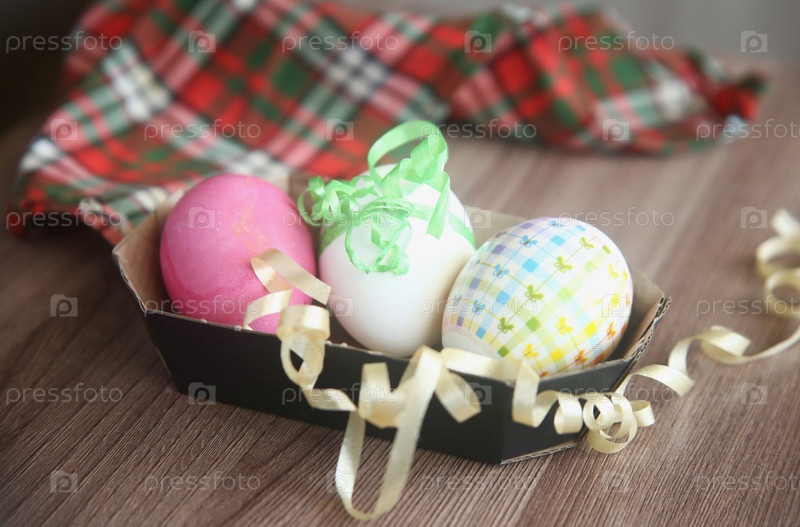 Яйца пасхальные цветные на столе, крупный план. Праздник светлой Пасхи