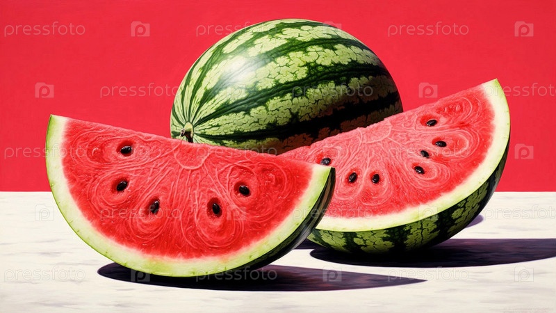 Спелый сладкий арбуз. Кусочки свежего арбуза крупный план на ярком фоне. Целый арбуз и разрезан на дольки