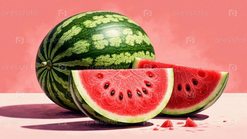 Спелый сладкий арбуз. Кусочки свежего арбуза крупный план на ярком фоне. Целый арбуз и разрезан на дольки