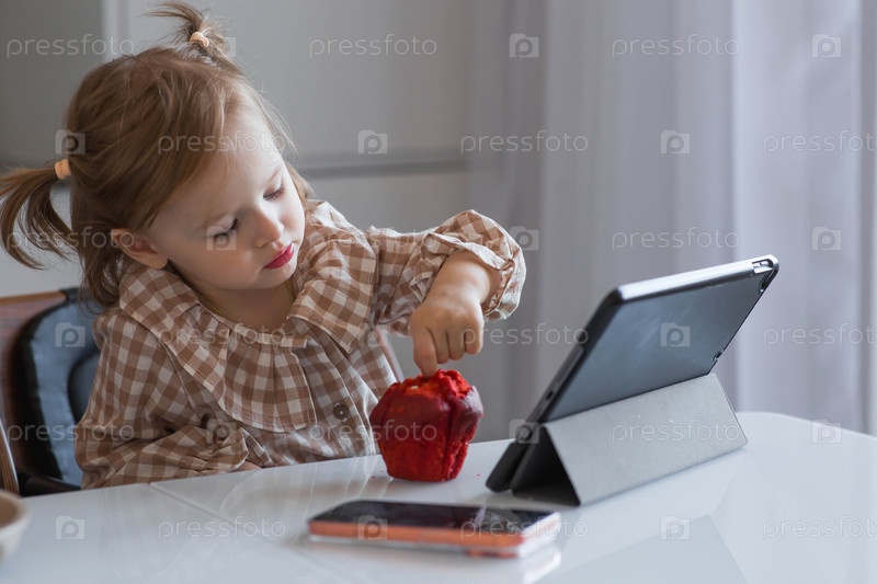 Милая 2-летняя девочка сидит за столом, ест кексы и играет с планшетом.Опасности гаджетов для детей.Защитите своего ребенка от смартфонов.Дети и гаджеты