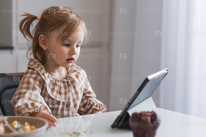 Милая 2-летняя девочка сидит за столом с планшетом. Ребенок играет с телефоном. Опасность гаджетов для детей. Защитите своего ребенка от смартфонов. Дети и гаджеты