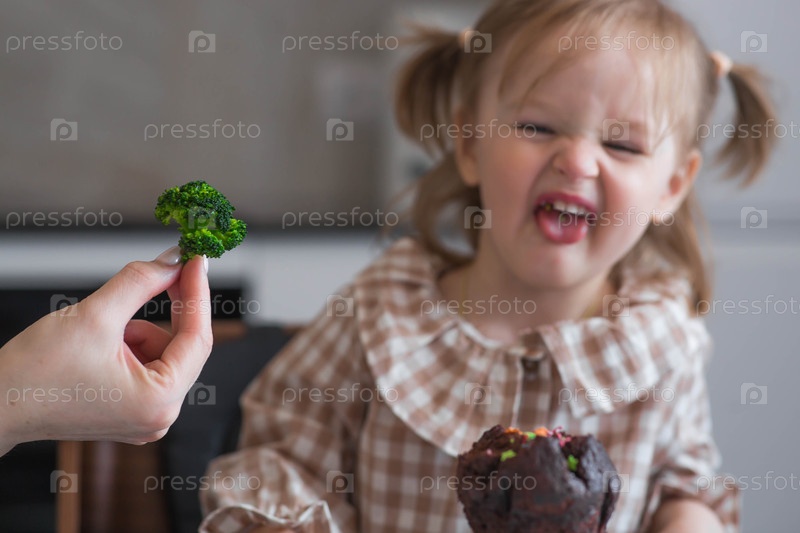Мать кормит маленькую девочку брокколи, и на столе лежит кекс. Ребенок отказывается есть овощи. Детская еда. Здоровая и нездоровая пища
