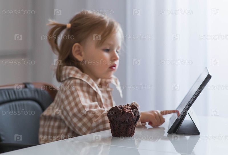 Милая 2-летняя девочка сидит за столом с планшетом. Ребенок играет с телефоном. Опасность гаджетов для детей. Защитите своего ребенка от смартфонов. Дети и гаджеты