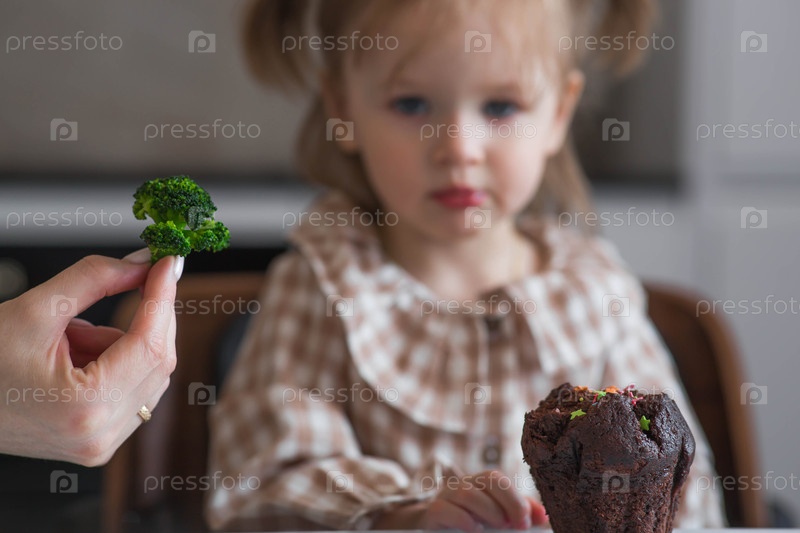 Мать кормит маленькую девочку брокколи, и на столе лежит кекс. Ребенок отказывается есть овощи. Детская еда. Здоровая и нездоровая пища