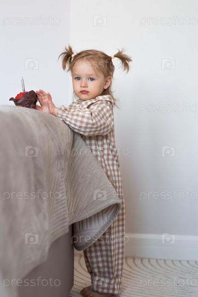Двухлетняя девочка с кексом или пирожком со свечой в домашней обстановке. Праздничное утро. С днем рождения