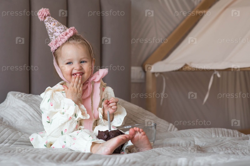 Двухлетняя девочка в праздничной шляпе с кексом или пирожком со свечой в домашней обстановке
