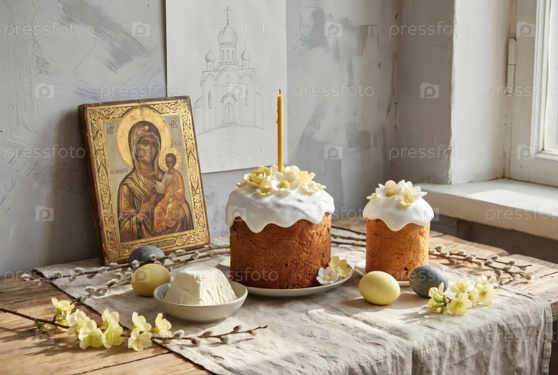 Пасхальные яйца, пасхальный торт, ива, цветы вишни и творог на серой стене с шаблоном храма.Концепция счастливой Пасхи 2026
