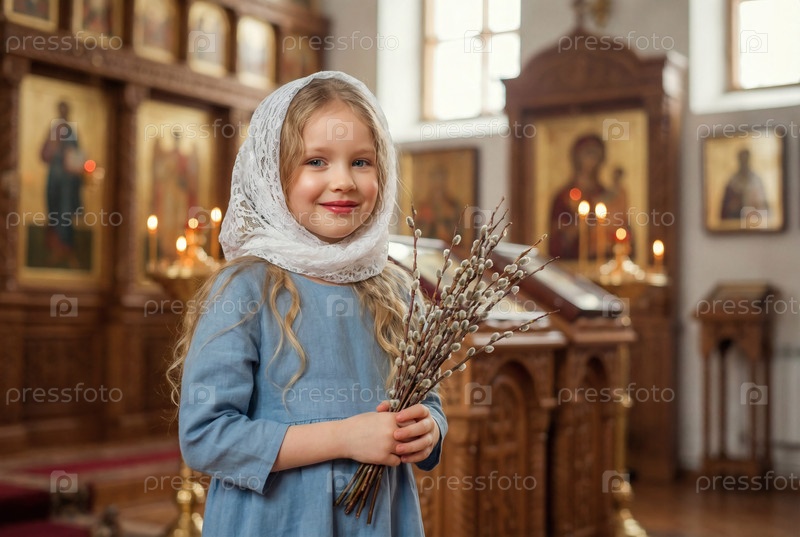 Религия и вера. Вербное воскресенье. Портрет маленькой девочки в русском народном наряде с букетом вербы внутри церкви
