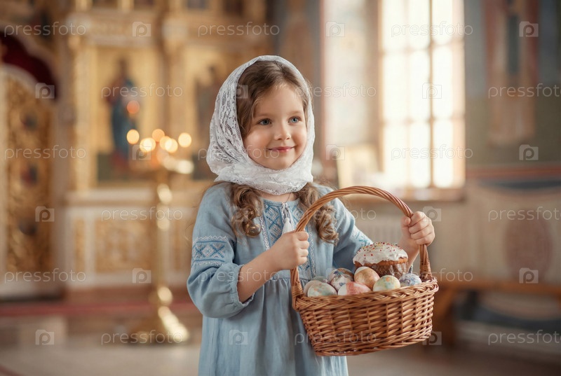 Религия и вера.Счастливого Пасхи.Портрет маленькой девочки в русском народном шарфе с плетеновой корзиной пасхальных яиц и пасхального кулича внутри церкви