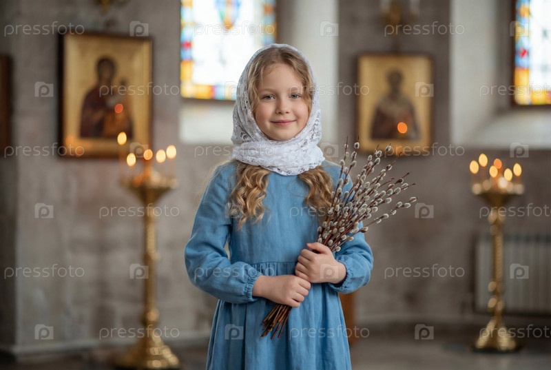 Религия и вера. Вербное воскресенье. Портрет маленькой девочки в русском народном наряде с букетом вербы внутри церкви