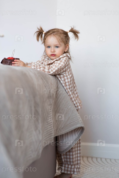 Двухлетняя девочка с кексом или пирожком со свечой в домашней обстановке. Праздничное утро. С днем рождения