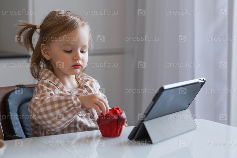 Милая 2-летняя девочка сидит за столом, ест кексы и играет с планшетом.Опасности гаджетов для детей.Защитите своего ребенка от смартфонов.Дети и гаджеты