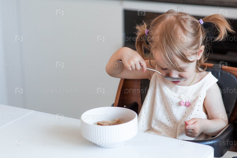 Двухлетняя девочка сидит за столом, ест кашу или суп с белой тарелки. детское питание. кормление ребенка. здоровая пища для детей