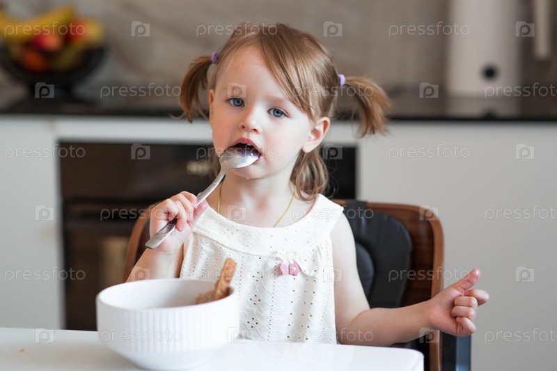 Двухлетняя девочка сидит за столом, ест кашу или суп с белой тарелки. детское питание. кормление ребенка. здоровая пища для детей