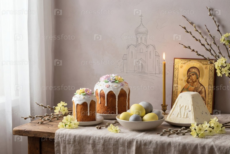 Пасхальные яйца, пасхальный кулич, ива, цветы вишни и творог на серой стене с шаблоном храма. Концепция счастливой Пасхи 2026