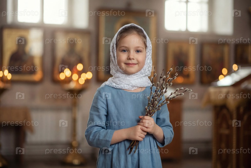 Религия и вера. Вербное воскресенье. Портрет маленькой девочки в русском народном платке с букетом вербы внутри церкви