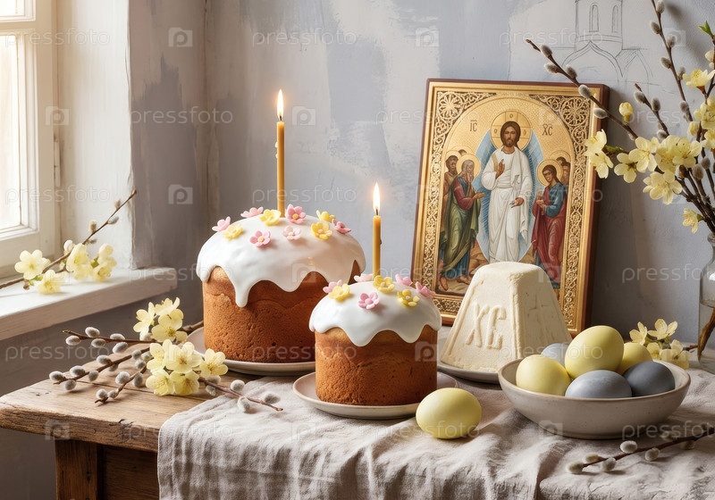 Пасхальные яйца, пасхальный кулич, ива, цветы вишни и творожная пасха на фоне серой стены с шаблоном храма. Концепция счастливой Пасхи 2026