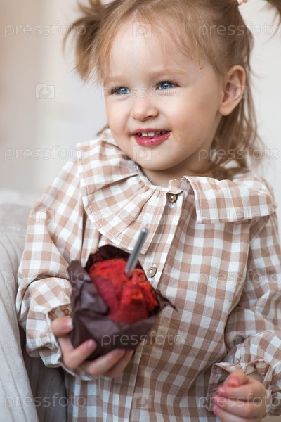 Двухлетняя девочка с кексом или пирожком со свечой в домашней обстановке. Праздничное утро. С днем рождения