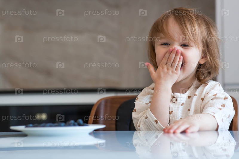 Двухлетняя милая девочка сидит за обеденным столом, ест чернику или малину. детское питание. кормление ребенка. здоровая закуска для детей