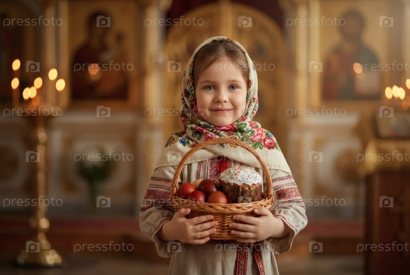 Религия и вера. Счастливой Пасхи. Портрет маленькой девочки в русском народном шарфе с плетеной корзиной пасхальных яиц и пасхального кулича внутри церкви