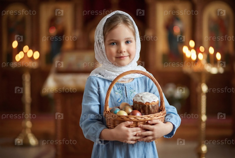 Религия и вера. Счастливой Пасхи. Портрет маленькой девочки в русском народном шарфе с плетеной корзиной пасхальных яиц и пасхального кулича внутри церкви