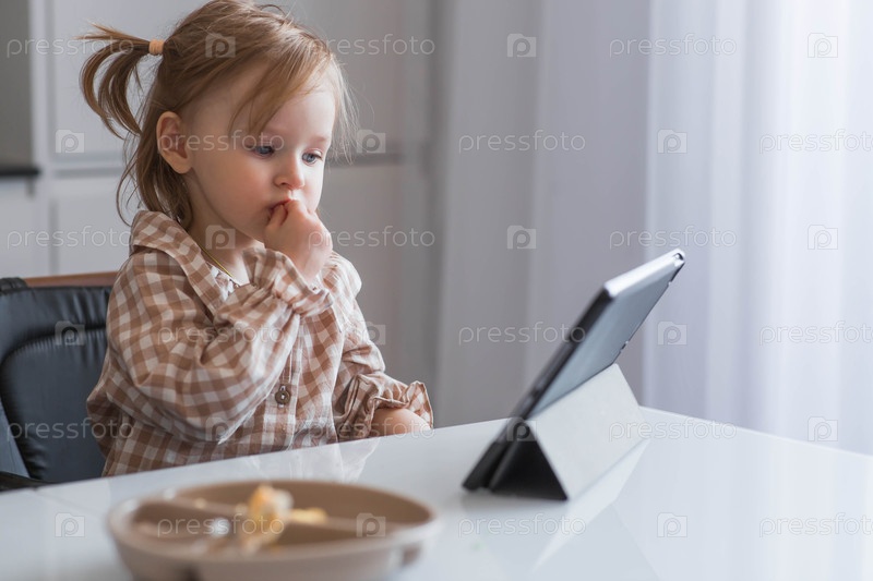 Милая 2-летняя девочка сидит за столом с планшетом. Ребенок играет с телефоном. Опасность гаджетов для детей. Защитите своего ребенка от смартфонов. Дети и гаджеты
