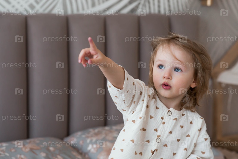 Милая двухлетняя девочка с удивленным лицом в комнате.Ребенок что-то увидел и показывает пальцем