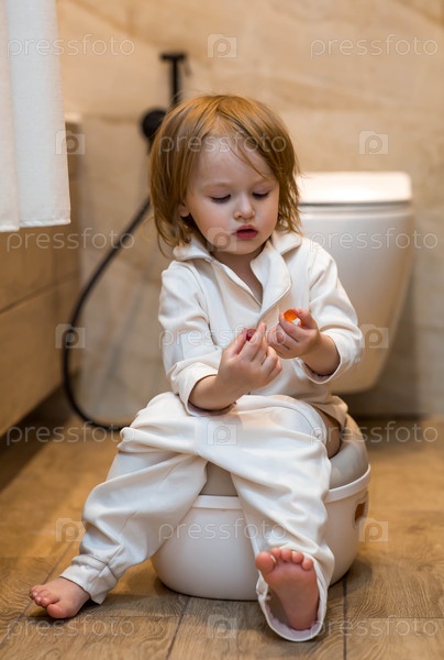 Милая двухлетняя девочка сидит на горшке в туалете и учит ребенка пользоваться горшкой