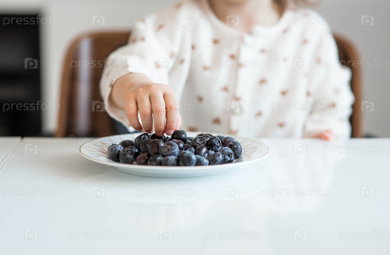 Двухлетняя милая девочка сидит за обеденным столом, ест чернику или малину. детское питание. кормление ребенка. здоровая закуска для детей