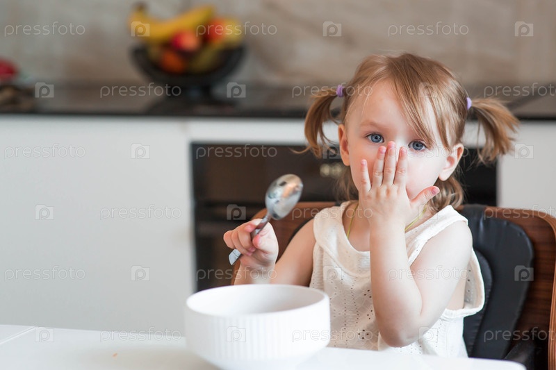 Двухлетняя девочка сидит за столом, ест кашу или суп с белой тарелки. детское питание. кормление ребенка. здоровая пища для детей